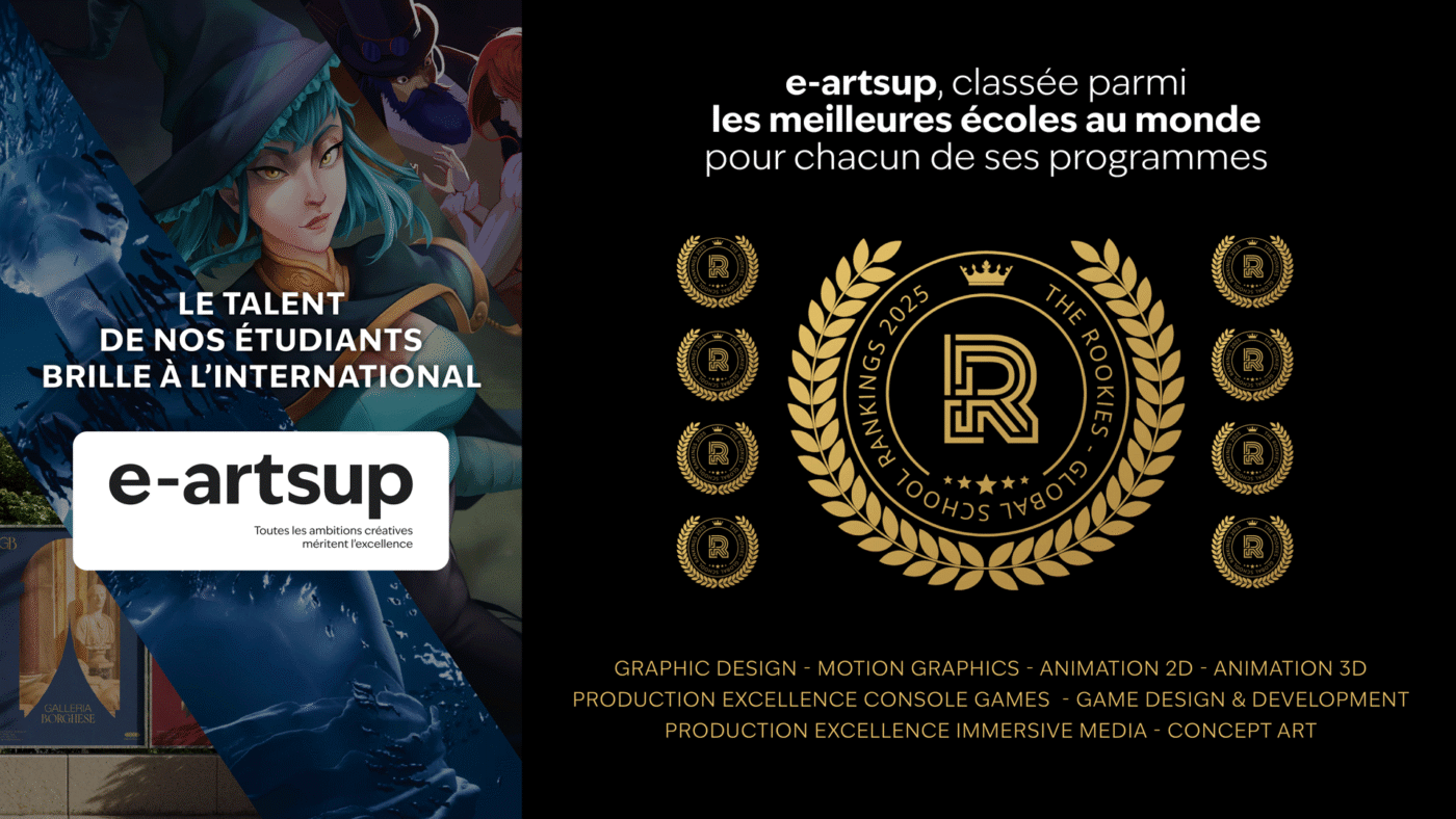 Une fois n’est pas coutume — l’ensemble des équipes administratives et pédagogiques sont fières qu’e-artsup a été reconnue parmi les meilleures écoles créatives au monde lors du prestigieux Classement The Rookies pour la troisième année consécutive. Cette reconnaissance confirme le rôle central d’e-artsup dans la formation de talents créatifs prêts à répondre aux exigences d’un marché des Industries Culturels et Créatives (ICC) en forte croissance. Elle souligne également la qualité exceptionnelle de notre pédagogie dispensée dans chacun des 11 campus de France.