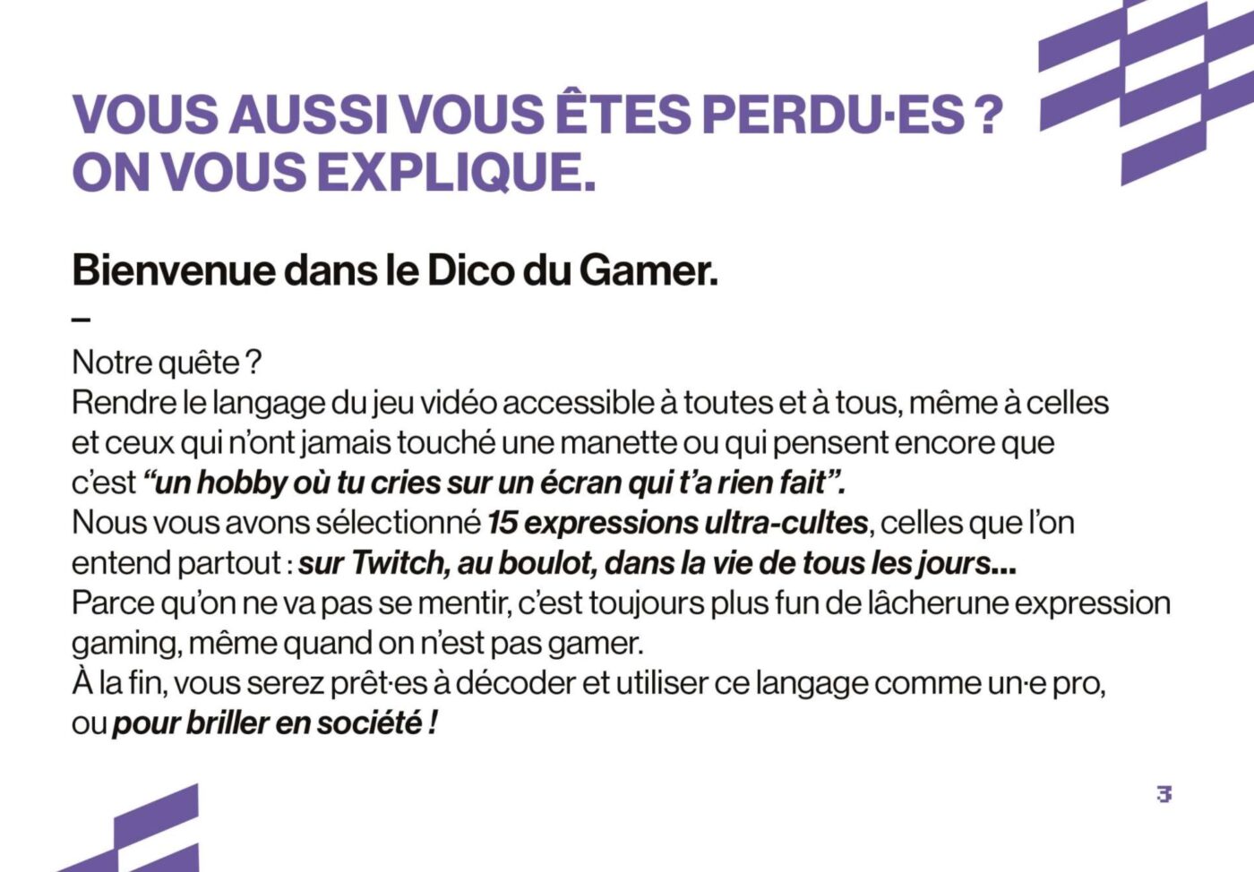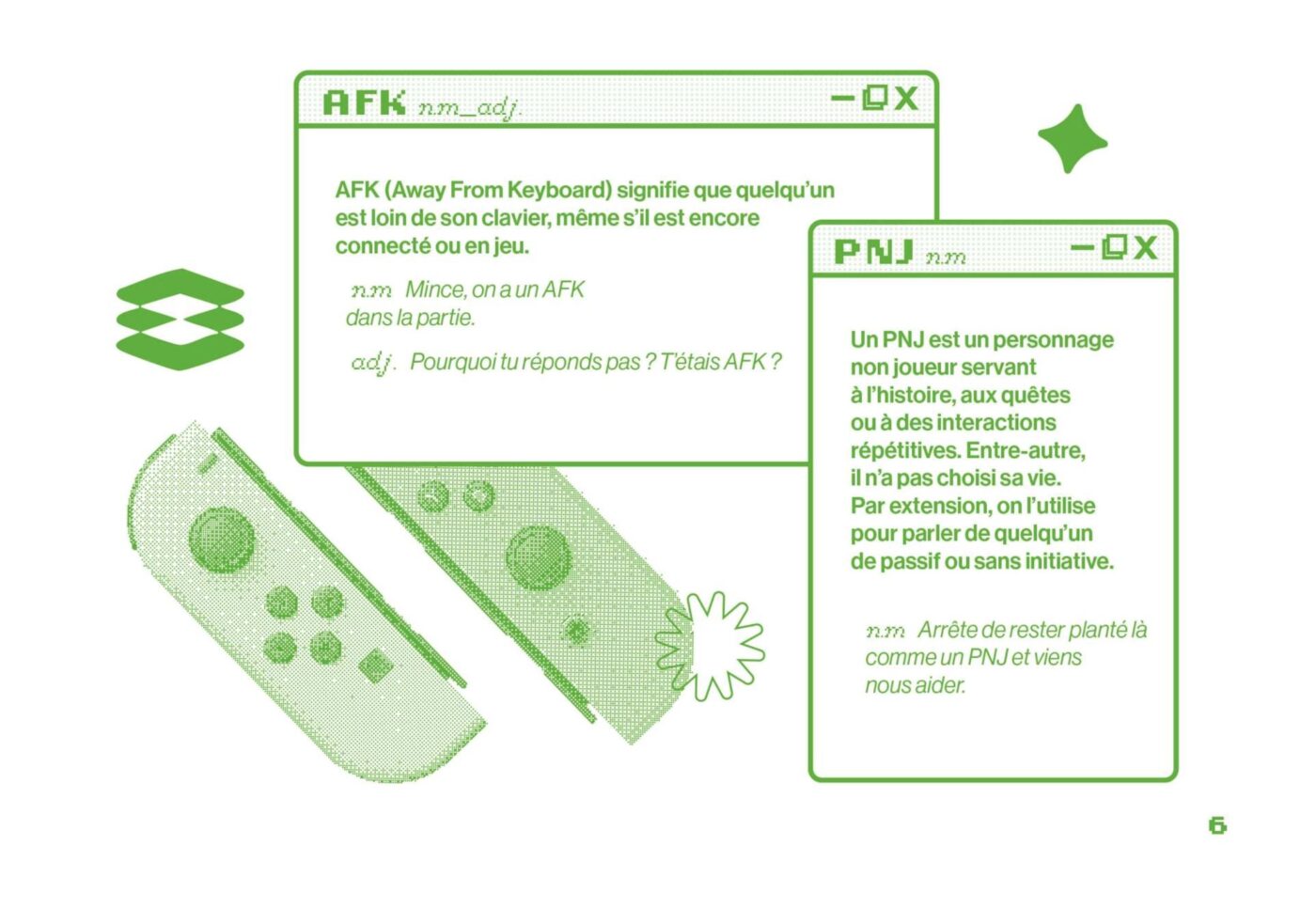 Ce dictionnaire nous invite à découvrir une douzaine de termes utilisés par les joueurs et joueuses de jeux vidéo et qui sont désormais entrés dans le langage populaire. On y retrouve des mots comme PNJ, Spawn ou encore Tryharder. Chacun est accompagné d’une phrase d’illustration de l’utilisation du mot dans la vie de tous les jours.