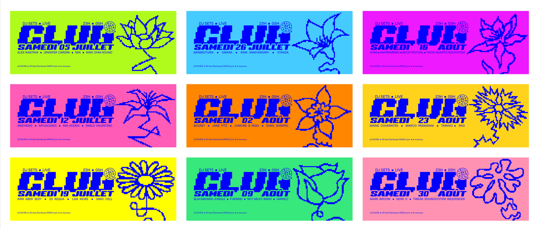Mais alors, quel rapport avec l’école e-artsup ? Et bien, il se trouve que Julien Roche, directeur de la communication chez Arty Farty, Léa Chaix, scénographe et Célia Péters, responsable communication du Sucre ont flashé sur les travaux de nos étudiants. Antoine Eckart et Jérémy Begel, designers graphiques et intervenants sur le campus de Lyon, ont donc organisé un workshop en situation réelle pour les étudiants du campus en 3e année en Bachelor Direction Artistique.