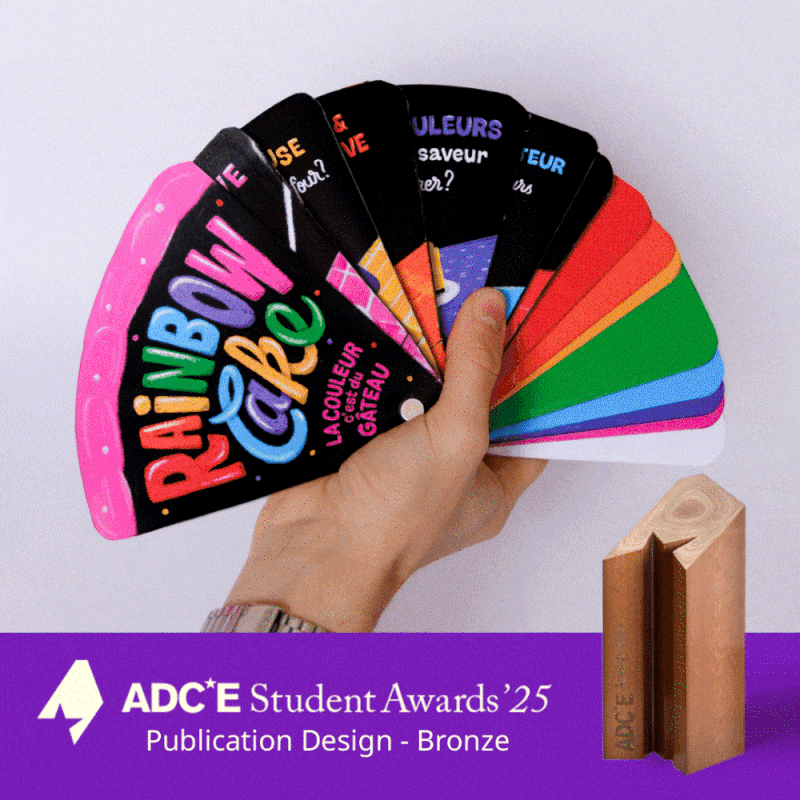 Qeulques semaines plus tard, en novembre 2025, Rainbow Cake traverse à nouveau les frontières francaises et reçoit le Prix Bronze aux ADCE Student Awards, dans la catégorie Publication Design. Une première distinction européenne prestigieuse qui vient renforcer la visibilité et la crédibilité du travail de Bastien au-delà du cadre scolaire.